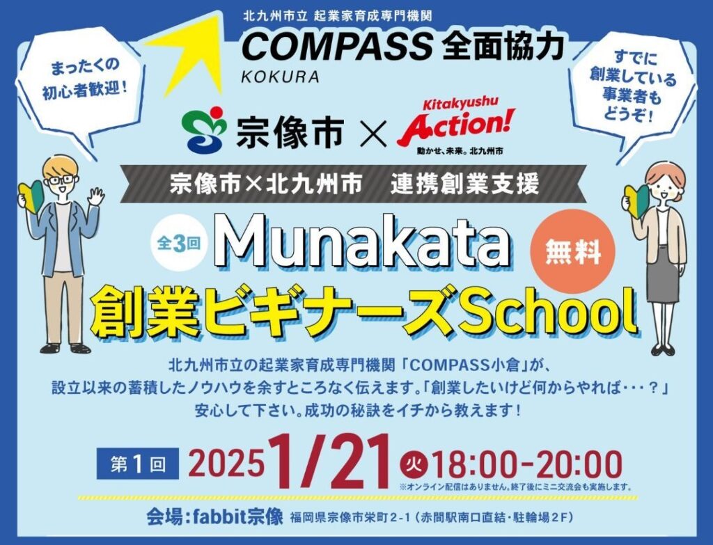「Munakata創業ビギナーズSchool」は、宗像市と北九州市が 初めて連携して開催する創業支援プログラムです。 本スクールでは、創業前の方や創業間もない方を対象に、創業や経営に必要な知識や実務ポイントを分かりやすく […]