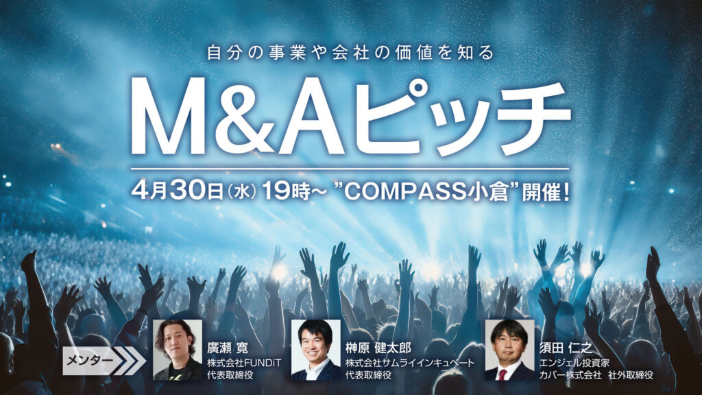 2025年4月30日(水)18時30分よりCOMPASS小倉にて、サイトキャッチャー株式会社主催の事業・会社を売却したい方のためのイベント「M&Aピッチ」を開催します。 「M&Aピッチ」は、売却を検討中の […]