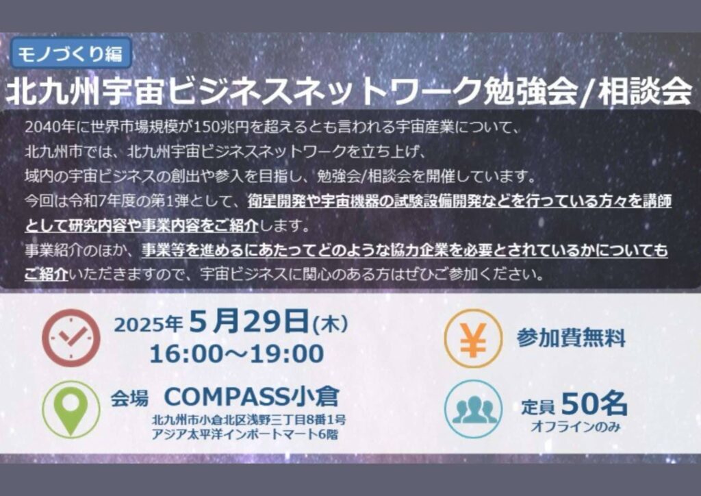 ご好評いただいております「北九州宇宙ビジネスネットワーク勉強会/相談会」について、 今年度も内容をさらに充実させて全5回程度開催いたします! 今回は、衛星開発や宇宙機器の試験設備開発などを行っている方々を講師として研究内 […]