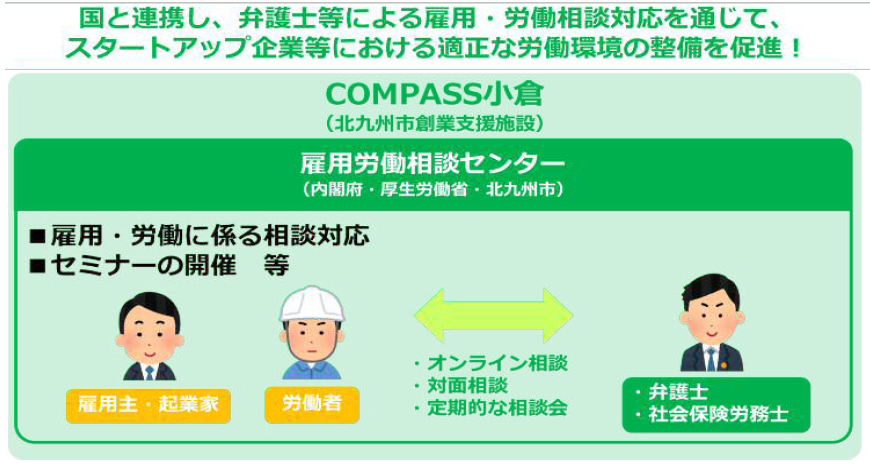 北九州市の創業支援の中核施設「COMPASS小倉」(正式名称:北九州テレワークセンター)では、創業に関する総合相談窓口を設置し、創業を考えている方の支援を行っています。この度、「日本一起業家に優しいまち」を目指している本市では、COMPASS小倉の機能を強化するため、国家戦略特区のメニューを活用した「北九州市開業ワンストップセンター」と「雇用労働相談センター」を下記のとおり開設します。
